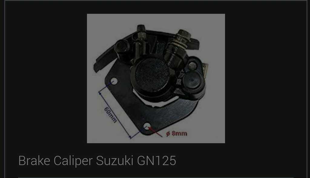 This front disc brake caliper is designed for the Suzuki GN125. It houses hydraulic pistons that clamp brake pads onto a disc, providing reliable and responsive braking performance under pressure.