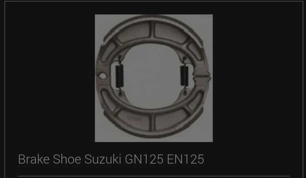 This mechanical drum brake shoe assembly fits Suzuki GN125 and EN125 motorcycles. It uses spring-tensioned curved friction linings to create braking force by pressing against the inside of the drum.